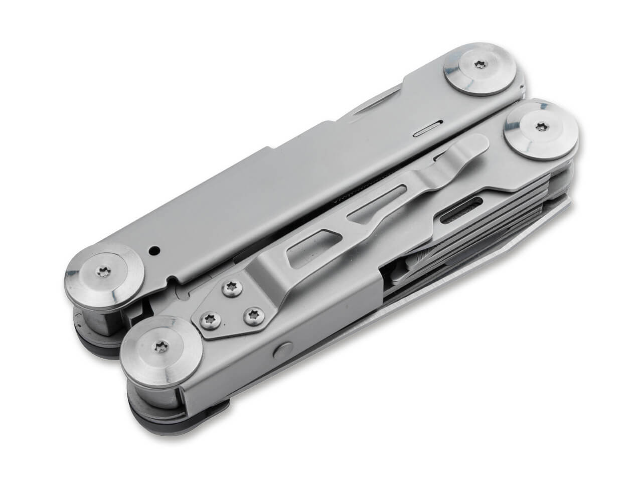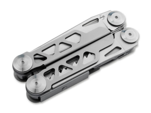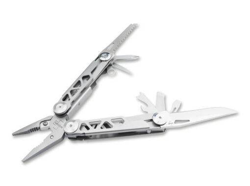 Supplied with various practical tools, the Boker Plus Specialist Pro is a versatile multitool with spring-assisted pliers. It has a reinforced, replaceable wire cutter and can withstand high loads. In addition to the flat gripping surface, the pliers are also have a so-called burner hole for gripping hexagon head screws, union nuts and pipes. The tools housed in the two halves of the handle open smoothly and can be used particularly safely thanks to the reliable locking mechanism. In addition to the combination pliers, the multitool’s equipment also includes a smooth blade, a wood saw, a can opener, a bottle opener, a wire bender/stripper, a sewing/drilling awl, a Phillips screwdriver, a slotted screwdriver and a metal file. The handle body made of stainless steel has decorative cut-outs. Supplied with a lanyard hole, a clip and high-quality nylon belt case.