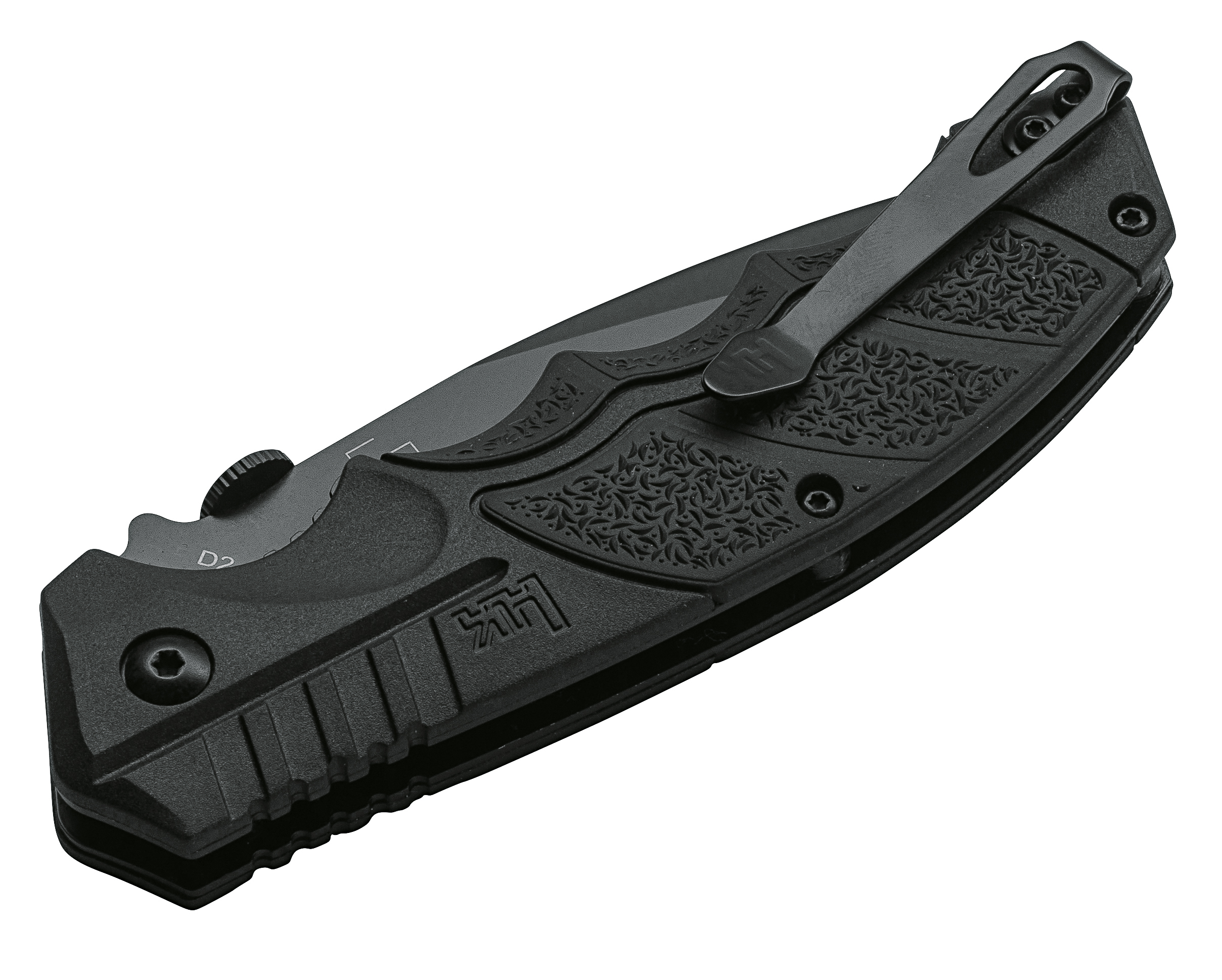 The Heckler & Koch SFP Tactical Folder is a reliable operational knife that incorporates design elements of the world-famous pistol and impresses with its robust Spearpoint blade made of D2. The blade, which has a stonewash finish, is opened with a removable thumb pin and securely locked by a stable liner lock. The steel blanks carry a polypropylene blade, which is equipped with directly injected, non-slip TPR rubber inserts at strategic points. Thanks to the ergonomically shaped finger grooves, which are modelled on the handle of the SFP9, the knife always lies securely in the hand, even when wet, and can be operated easily even when wearing gloves. The handle shells and the deep carry clip (tip-up/r) have an embossed Heckler & Koch logo. With high-quality nylon case for storage.
