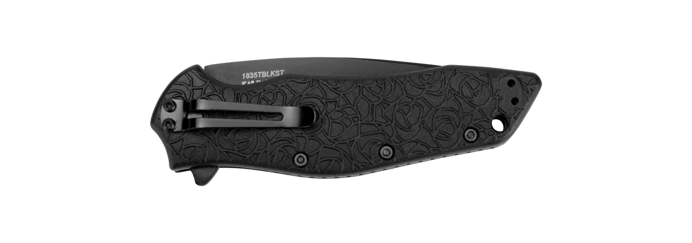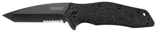 The Kuro’s blade is an Americanized tanto with partial serration and a drop point for strong piercing. The edge provides good slashing capability while the partial blade serration offers versatility for cutting fibrous materials with ease. For speedy, one-handed opening, the Kuro has Kershaw’s assisted opening, accessed with the built-in flipper. The ambidextrous flipper works perfectly for both lefties and righties. The handle scales are glass-filled nylon for durability and dimensional stability, even in temperature extremes. The eye-catching pattern on the scales offers additional grip traction and looks like nothing else.